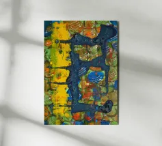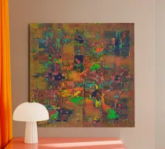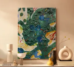 "Motion" is a meditative, abstract composition that celebrates the theme of flowing movement. The work is dominated by a rich palette of green tones, from soft mint green to deep forest green, which organically merge into one another through the flowing technique. The texture is reminiscent of the continuous growth of plants or the gentle flow of water. Accents of dark purple and soft grey add visual highlights to this dynamic celebration of natural, unstoppable movement.