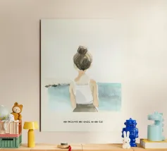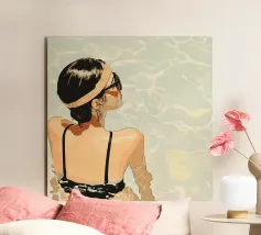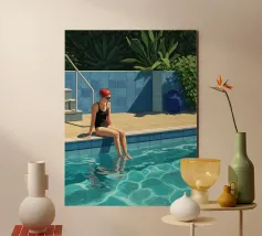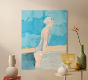 Bathed in liquid light, a lone swimmer lingers at the pool’s edge — her silhouette softened by watercolor’s gentle wash. Strength and serenity intertwine as she gazes into the blue, a quiet moment suspended between motion and memory, painted with breath and grace