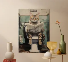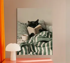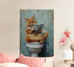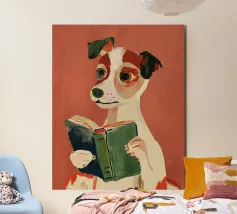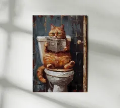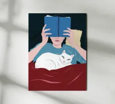 A contemplative portrait of a cat absorbed in a vivid red book, painted in soft, expressive strokes. The scene balances quiet humor with introspection, suggesting curiosity, patience, and the subtle frustration of seeking meaning. Calm and thoughtful, this artwork captures a moment where questions linger — and silence becomes part of the answer.