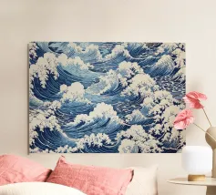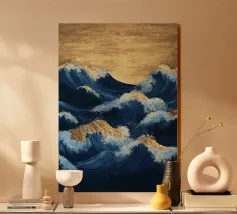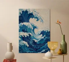 The picture shows sweeping ocean waves in blue and white - stylised, dynamic and with illustrative depth. The style is reminiscent of hand-painted watercolours or digital art with a fine texture. It appears calm and powerful at the same time - an aesthetic homage to the sea.