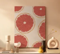 A vibrant, graphic pattern of repeating orange slices against a white and orange striped background. The composition is fresh, zesty, modern, and a cheerful celebration of citrus fruit.