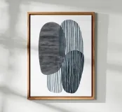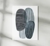 A clean minimalist abstract featuring overlapping oval shapes in soft charcoal tones with vertical line patterns. The interplay of solid washes and linear textures creates rhythm and harmony, reflecting Scandinavian design simplicity and modern geometric abstraction.