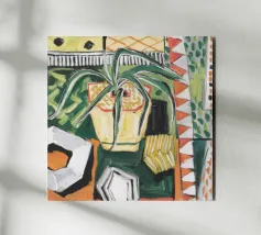 A still life of a potted plant and other objects on a table with a colorful, patterned rug underneath. The composition against a pink wall is modern, eclectic, and full of charming, decorative detail.