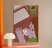 A friendly, warm-toned illustration showing someone using a computer mouse with both hands, alongside a keyboard and drink cup.