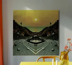 Nicolas Messaritis grew up in Cyprus but moved to London to study architecture at the age of nineteen. He explores themes of escapism and invasion in his photographic collages which juxtapose desert landscapes with geometric shapes and man-made structures. His work is influenced by photographers and illustrators such as Mark Weaver and Rob Sherridan, and architects like Mies Van Der Rohe and Frank Lloyd Wright. Looking out of the bus while riding through the city, having discussions about form and function, and listening to Nick Cave, Tom Waits, and David Bowie on his headphones also provide the experimental architect with inspiration.