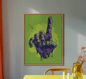 A colorful and detailed cartoon illustration of a zombie hand with vivid green and purple tones, dripping textures, and extended index finger. The hand is set against a bright green splatter background for a spooky effect.