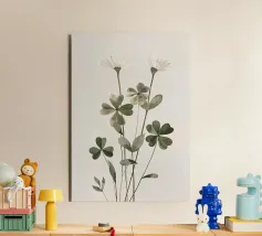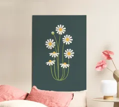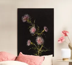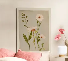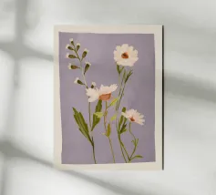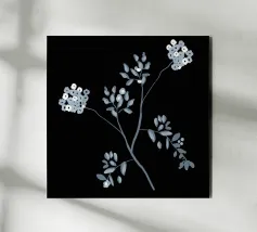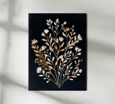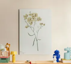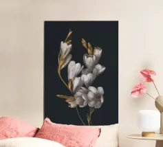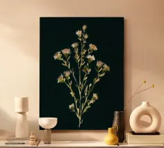 A delicate botanical study stands luminous against a deep, moody backdrop. Soft white and pale ochre blossoms bloom along slender stems, their watercolor textures giving a feeling of quiet presence. This minimal composition evokes the stillness of night and the resilience of wildflowers under starlight—perfect for calm, refined interiors.