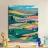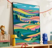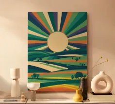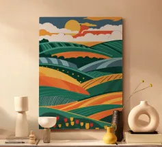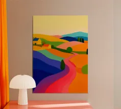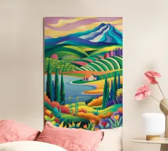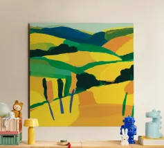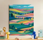 A beautiful landscape of rolling hills and fields, rendered in a colorful patchwork of greens, blues, pinks, and yellows, evoking a sense of idyllic countryside.