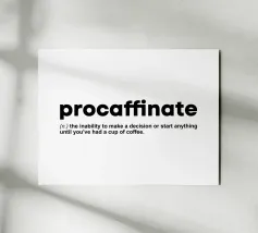 Embrace your coffee addiction with our witty "Procaffeinating" typography art print. This clever design presents a humorous definition in crisp white text on a sleek black background, mimicking a dictionary entry. Perfect for coffee lovers and procrastinators alike, it adds a touch of relatable humor to any kitchen, office, or café. The stark contrast and formal typography style create a visually striking piece that's both amusing and stylish. Available on various products, this versatile design makes an ideal gift for anyone who can't function without their daily brew.