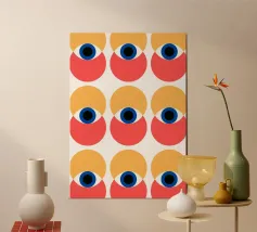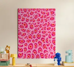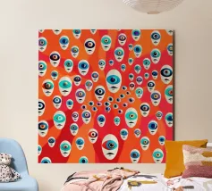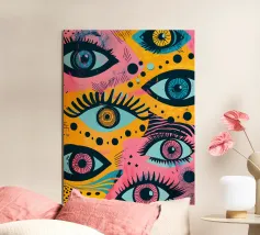 A mesmerizing and psychedelic pattern featuring repeating eyes amidst swirling, organic pink and magenta shapes. This bold and surreal artwork is both hypnotic and intensely energetic.