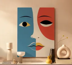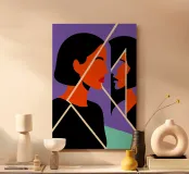 Two faces - or just one? This modern work of art shows a woman in front of a splintered mirror in which her own reflection appears broken and reassembled. With clear areas of colour, strong purple, orange and black, the picture is a statement about identity, self-perception and inner conflicts. Ideal for modern rooms with depth.