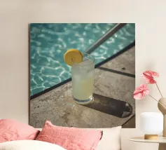 The photograph captures a serene moment on a sun-drenched rooftop in Marrakech, where the vibrant blue sky meets the tranquil waters of a polished, neutral beige-colored pool. A glass of crystal-clear water stands gracefully beside the pool’s edge, catching the sunlight, which reflects off the smooth surface of the water. The surrounding pool bath , with its warm, neutral tones, enhance the calm, minimalist elegance of the scene.