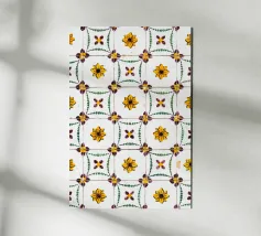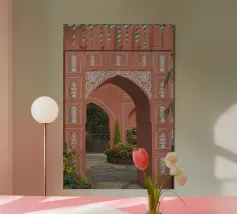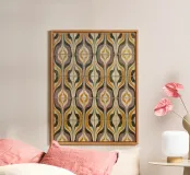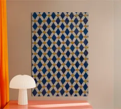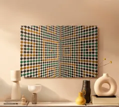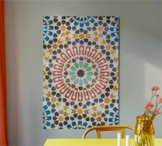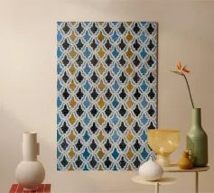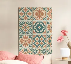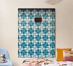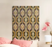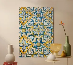 This artwork captures a striking tile pattern from Matosinhos, Portugal, where geometric forms and retro colors come together in perfect harmony. The abstract design, with tones of ochre, lavender, olive, and cream, reflects a mid-century modern aesthetic while carrying the cultural heritage of traditional Portuguese azulejos.
