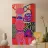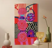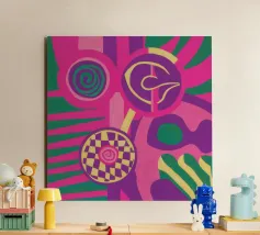 A dynamic abstract composition features bold, rhythmic shapes, spirals, and patterns in a vibrant palette of reds, pinks, blues, and black, creating an energetic and visually stimulating piece.