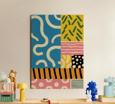 A vertical abstract composition with a cascade of colorful, rhythmic shapes and patterns, including waves, grids, and organic forms, in a palette of orange, blue, and teal.