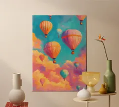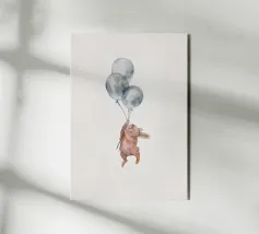 A magical vertical illustration capturing a whimsical moment as a group of bunnies prepare for a balloon-powered rocket launch. Set on a wooden platform under a dreamy sky, the scene blends engineering, fantasy, and teamwork in pastel tones. Perfect for a child's room or anyone who dreams of exploration and adventure with a soft, painterly charm.