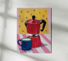 A classic coffee moment is captured with a tall red coffee pot and a pink cup on a yellow and white checkered tablecloth, set against a deep blue background, creating a cozy and colorful scene.