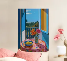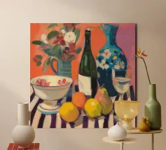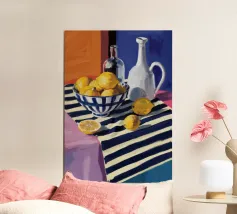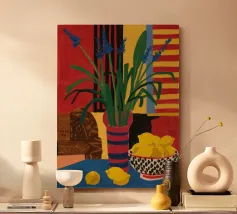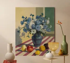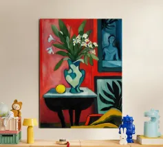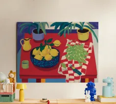 An inviting still life on a bright red table, featuring a bowl of lemons and a blue vase holding delicate white flowers. The warm yellow background enhances the cozy and vibrant atmosphere.