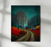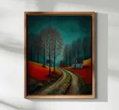 Red blossoms burn in quiet air, Three homes dream beneath a teal sky. The road carries soft memories, And peace walks slowly beside sorrow.