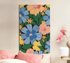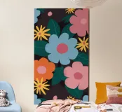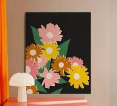 A simple and cheerful pattern of stylized daisies in various colors against a dark background creates a classic, beautiful, and timeless floral design.