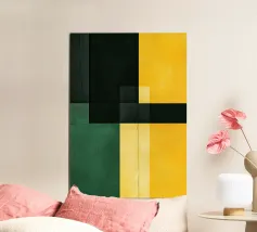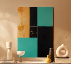 Minimalist painting in the style of white on a beige background, three rectangular colour fields in emerald green and black with gold leaf accents. One field is monochrome and the other two fields have subtle colour gradients. Minimalism, painting.