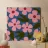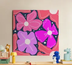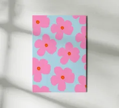 A seamless pattern of stylized pink flowers with yellow centers on a solid dark blue background. The simple, bold forms create a classic and cheerful floral design with a modern, graphic appeal.
