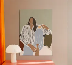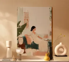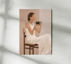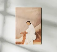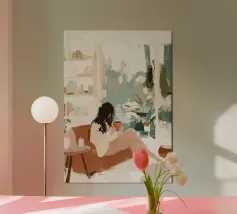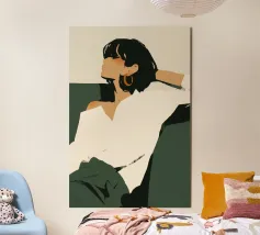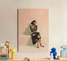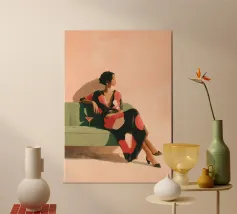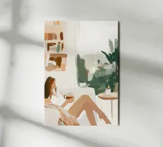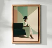 Blending mid-century tones and modern grace, this piece explores the intersection of shape and solitude. The soft color palette and bold geometry echo the woman’s tranquil presence, crafting a composition that feels like visual jazz—sophisticated and effortless.