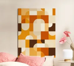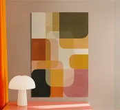 This abstract artwork blends modern clarity with vintage warmth through a composition of rounded geometric forms arranged in a loose grid. Overlapping shapes create gentle intersections, where transparency and color layering generate depth and visual rhythm. A muted palette of ochre, olive, terracotta, blush, and cream evokes mid-century design while remaining distinctly contemporary. Subtle surface texture adds a tactile quality, softening the structure. The piece balances order and fluidity, offering a calm yet engaging visual experience ideal for modern, minimalist interiors.