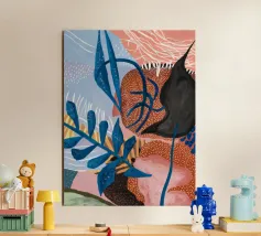 An abstract composition built with layered shapes that suggest leaves and textile patterns, in a sophisticated palette of blues, terracotta, beige, white, and a subtle hint of red.