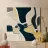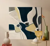 Abstract composition of various forms in shades of beige, off-white, dark navy blue and black. The shapes are irregular and layered, with areas of solid color and areas of texture. Some white lines and strokes define the edges of the shapes. The piece is predominantly neutral tones with pops of yellow ochre. The composition is balanced, with shapes of varying sizes placed throughout the image. Colors are muted and create a calm and serene atmosphere. The overall impression is one of organic forms and textures.