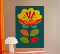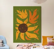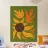 Bright yellow and orange abstract forms resembling a sunflower. Curved shapes and small lines add a dynamic sense of movement to the composition.