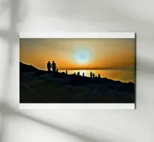 the silhouette of a group of people on the rocky shores admiring the sunset on a summer day.