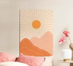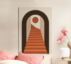 A minimalist composition combining bold stair-like shapes with a radiant sun, opening a window to an abstract orange sea. This artwork balances calm and energy, making it a striking accent piece for any modern living space.