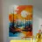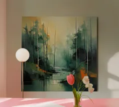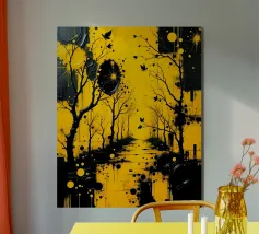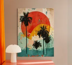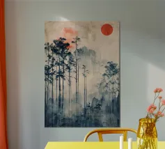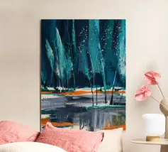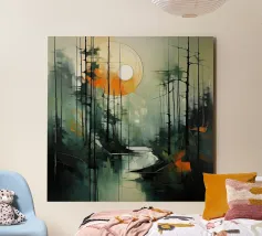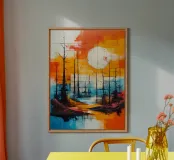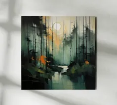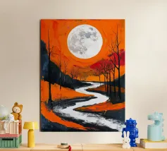 A vibrant and abstract painting capturing the essence of a serene sunset. Bold strokes of orange and blue create a dynamic contrast, while the silhouetted trees and a large, luminous moon add depth and mystery to the scene. This piece is perfect for contemporary spaces seeking a touch of nature and tranquility.