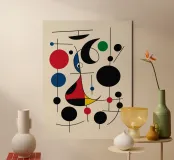 An abstract composition features bold geometric shapes and primary colors, such as red, blue, green, and yellow. The arrangement includes circles, lines, and curves that create a sense of movement and balance.