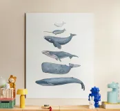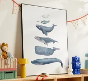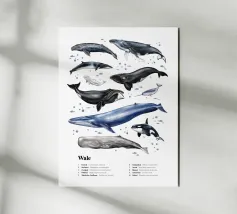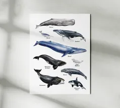 Hand-drawn illustrations of various whales in ink and watercolours.
