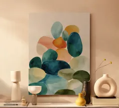 A modern still life in soft watercolor, this piece balances smooth stones and sun-bleached driftwood in gentle harmony. Cool indigos, warm sand tones, and subtle textures echo the calm geometry of a shoreline collection—simple, meditative, and serene.