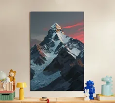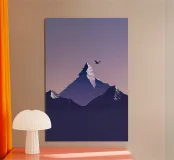 This minimalist interpretation of K2 captures its towering majesty under a soft pastel sky. A single bird soars above, adding a touch of life and freedom to the serene and pristine setting. The sharp angular peaks are depicted with subtle gradients, enhancing the mountain’s grandeur and timeless allure. The simplistic yet bold composition invokes feelings of solitude and harmony with nature, making this piece a perfect symbol of quiet adventure and boundless exploration.