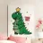A cheerful green dinosaur is humorously decorated to resemble a Christmas tree, complete with colorful lights and a star on its head. The words "Tree Rex" are playfully written beside it, adding to the festive theme.