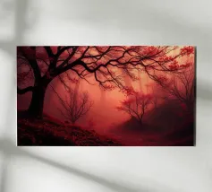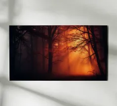 A digital painting of an autumn forest features dark tree silhouettes against a warm, golden background. The textured artwork showcases detailed foliage in shades of orange and brown, creating a serene and atmospheric woodland scene.