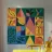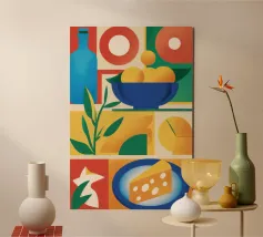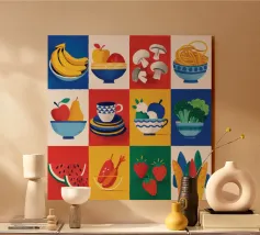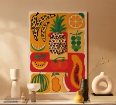 A bold and dynamic patchwork of geometric shapes, featuring stylized bananas and tropical leaves. The vibrant color palette and strong graphic style create a playful and energetic composition.