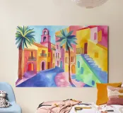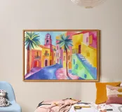 A vibrant stylized watercolor artwork featuring a rustic rural village, reminiscent of the colorful charm found in the Caribbean, Mexico, or Southern Europe. With its bright palette and expressive brushstrokes, the design exudes warmth, character, and a touch of wanderlust. Perfect as wall art or home decor, it also makes a delightful choice for accessories and thoughtful gifts, appealing to anyone who loves travel-inspired art and the romance of sun-drenched village scenes.