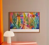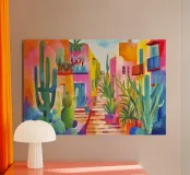 Tropical Village Rural Charm is a mesmerizing mural that transports you to the vibrant streets of a idyllic tropical village, where the essence of Mexico and the Caribbean intertwine in a symphony of color and culture. Picture winding streets lined with quaint adobe houses, adorned with potted plants in cheerful pastel hues.
