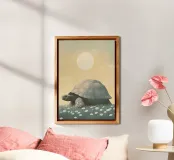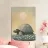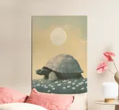 A large turtle, a simple and elegant illustration of the massive creature walking through grass with white flowers under a pastel coloured sky with a sun in the background. The artwork is presented in a vintage aesthetic style with muted colours and soft lighting creating a tranquil atmosphere.