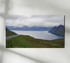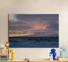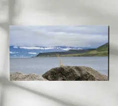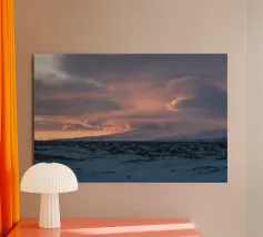 A vast, primordial landscape rests under a heavy, brooding sky. This dramatic photograph captures the untamed spirit of the Icelandic wilderness, where distant, snow-capped mountains watch over an empty plain. Passing rain showers drift across the rugged peaks, adding to the moody, atmospheric beauty of the scene. A powerful tribute to the wild, elemental forces of nature, this piece is a window into a world of epic solitude and breathtaking scale. A perfect, contemplative statement for any space.