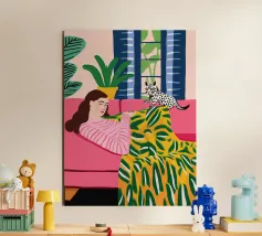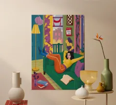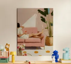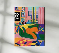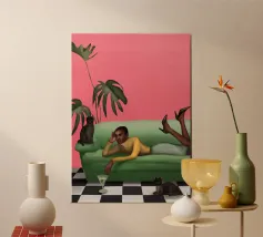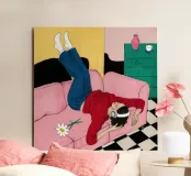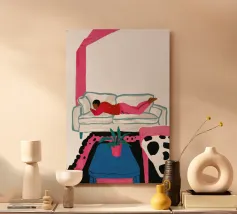 A woman lies upside down on a pink sofa, with her legs in the air, on a checkered floor. The composition is playful, quirky, and a fun, modern depiction of carefree, youthful relaxation.