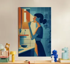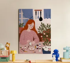 This artwork shows a person with blonde hair looking into a vanity mirror. The background is filled with floral wallpaper, and the vanity table is adorned with various items, creating a nostalgic and intimate scene.