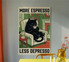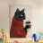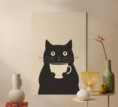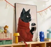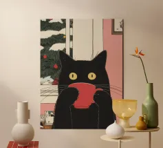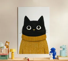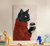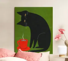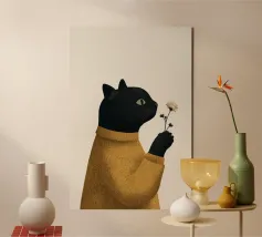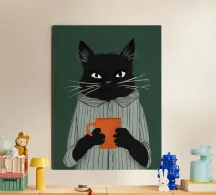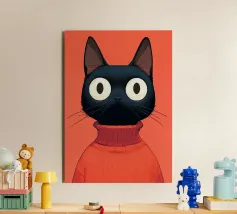 This artwork presents a minimalist yet expressive character study, where a black cat adopts a human-like gesture of pause and reflection. The strong contrast between the dark figure and the soft, neutral background creates visual clarity and calm. The oversized red sweater introduces warmth and texture, balancing the sleek silhouette of the cat. Clean lines, subtle grain, and restrained color choices transform a simple moment into a quiet meditation on comfort, routine, and gentle introspection.