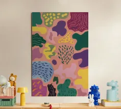 An abstract composition of flowing, wavy lines and organic shapes in a vibrant palette of green, pink, blue, and orange, creating a sense of joyful movement and rhythm.