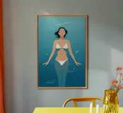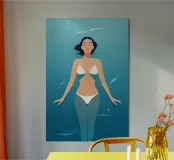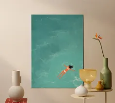 A woman floating effortlessly in clear water, her form blending with the ocean’s calm. This minimalist piece captures freedom, stillness, and connection with nature.